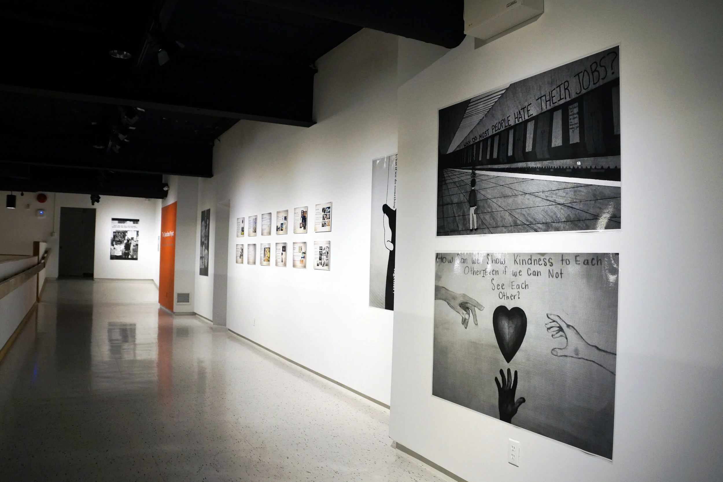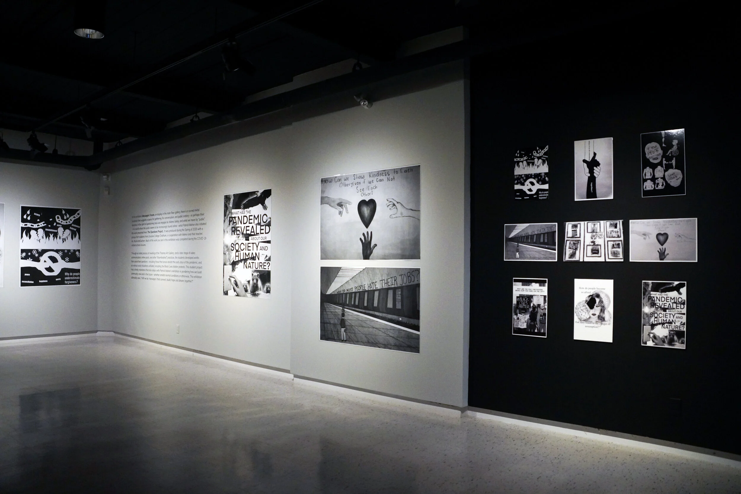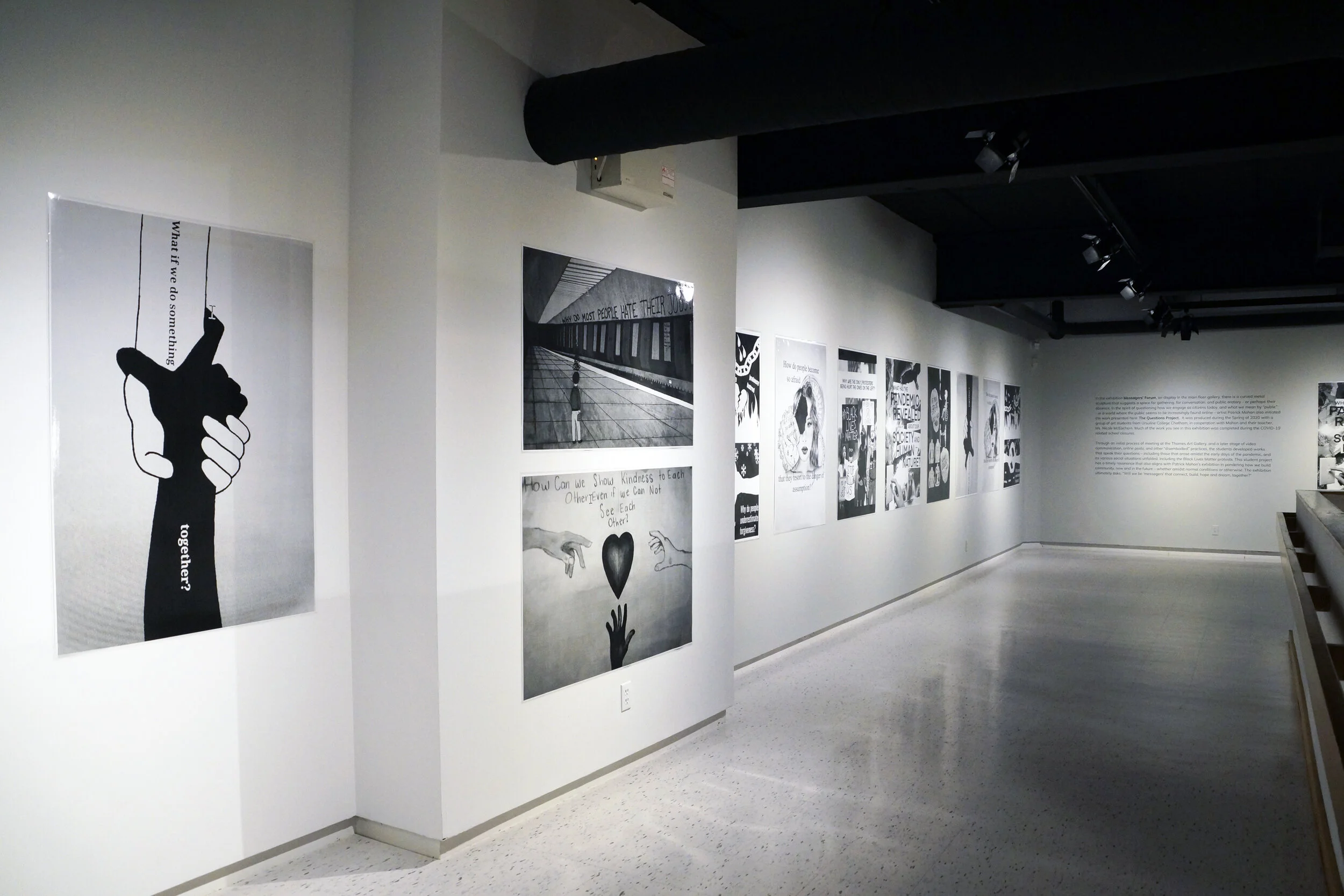 Accompanying Patrick Mahon’s Messagers’ Forum, a graphic poster installation entitled The Questions Project was presented by the students of Ursuline College Chatham in the Thames Art Gallery’s Community Gallery. In collaboration with artist Patrick Mahon, as well as their teacher Nicole McEachran, the students began work on this project in the winter of 2020. With the onset of COVID-19 in March of that year, the collaboration process was adapted amidst required school closures. Through video communication, online posts and other distanced and “disembodied” practices, the students developed works that spoke directly to questions they had regarding various unfolding social circumstances – including questions that arose amidst the early days of the COVID-19 pandemic and those that surrounded the Black Lives Matter protests. Ultimately, the students’ project had a timely resonance that aligned with Patrick Mahon’s exhibition in pondering how we build community, now and in the future, under conditions of normalcy or otherwise. Inferentially, it asked us: can we be “messagers” that connect, build, hope, and dream together?