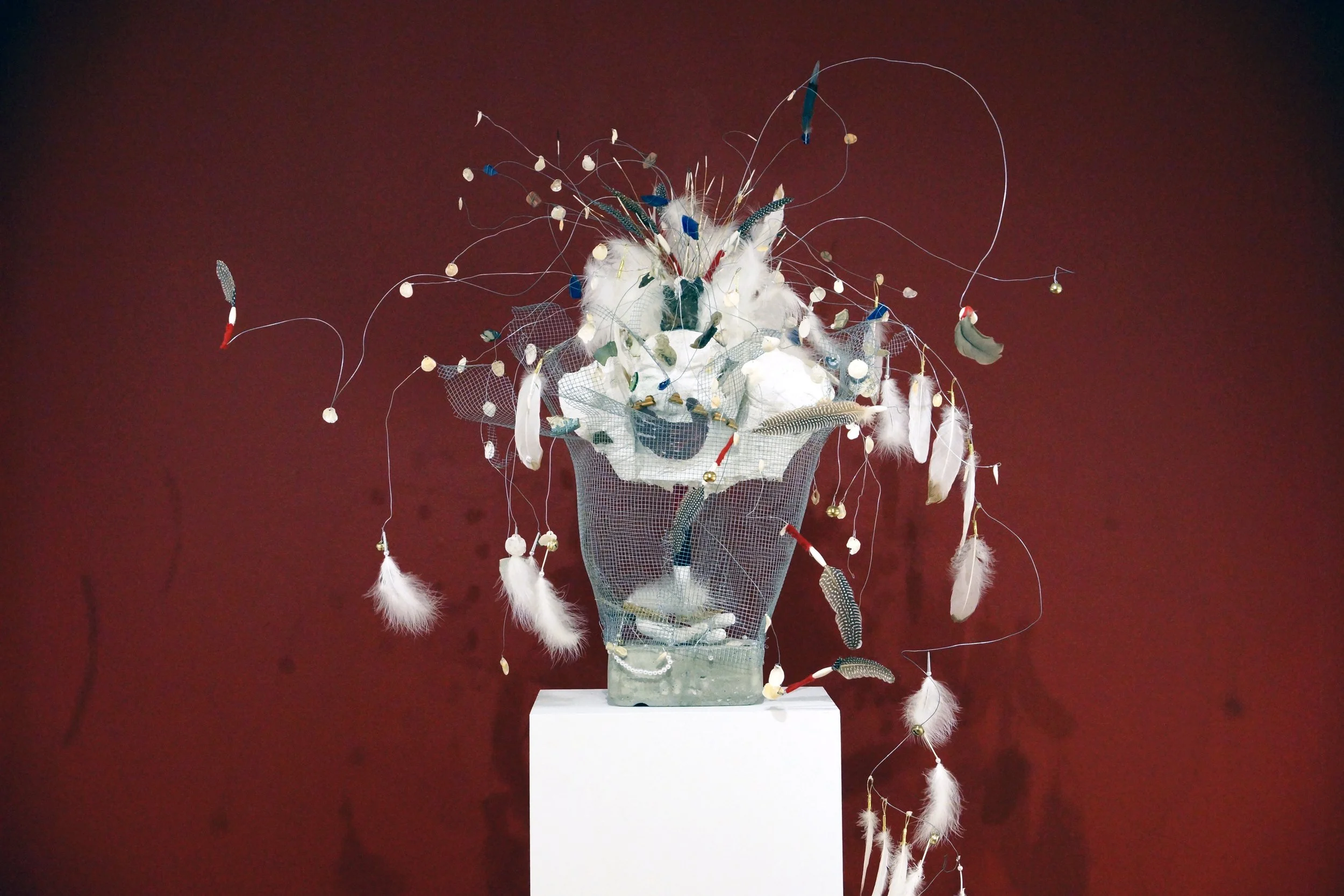 Darla Fisher-Odjig , The Movement, 2021-2022 . 48” W x 46” H 37”D. Plaster of Paris, excavated China pottery, Culturally traditional & Contemporary objects wire netting, cement.