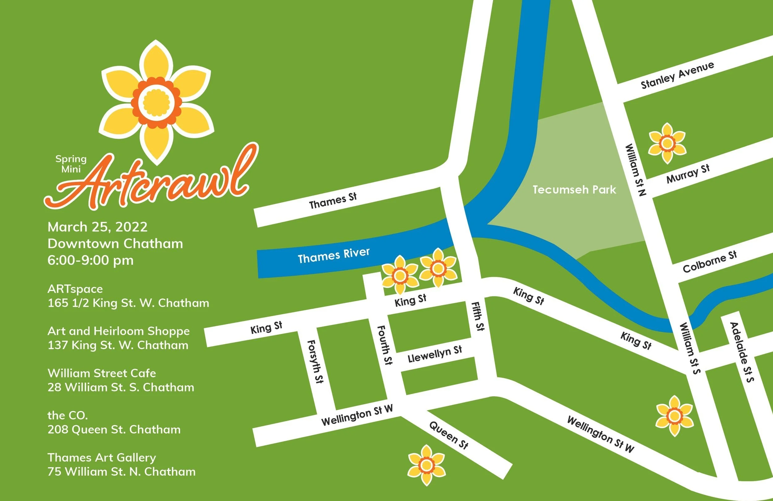 After a two-year pandemic hiatus, the Thames Art Gallery and ARTspace are excited to announce the return of the Mini-ARTcrawl. Mark Friday, March 25 on your calendar and join the galleries along with Art and Heirloom Shoppe, William Street Cafe, and The Co., in a festive evening of art and creativity in downtown Chatham between 6:00 pm and 9:00 pm.