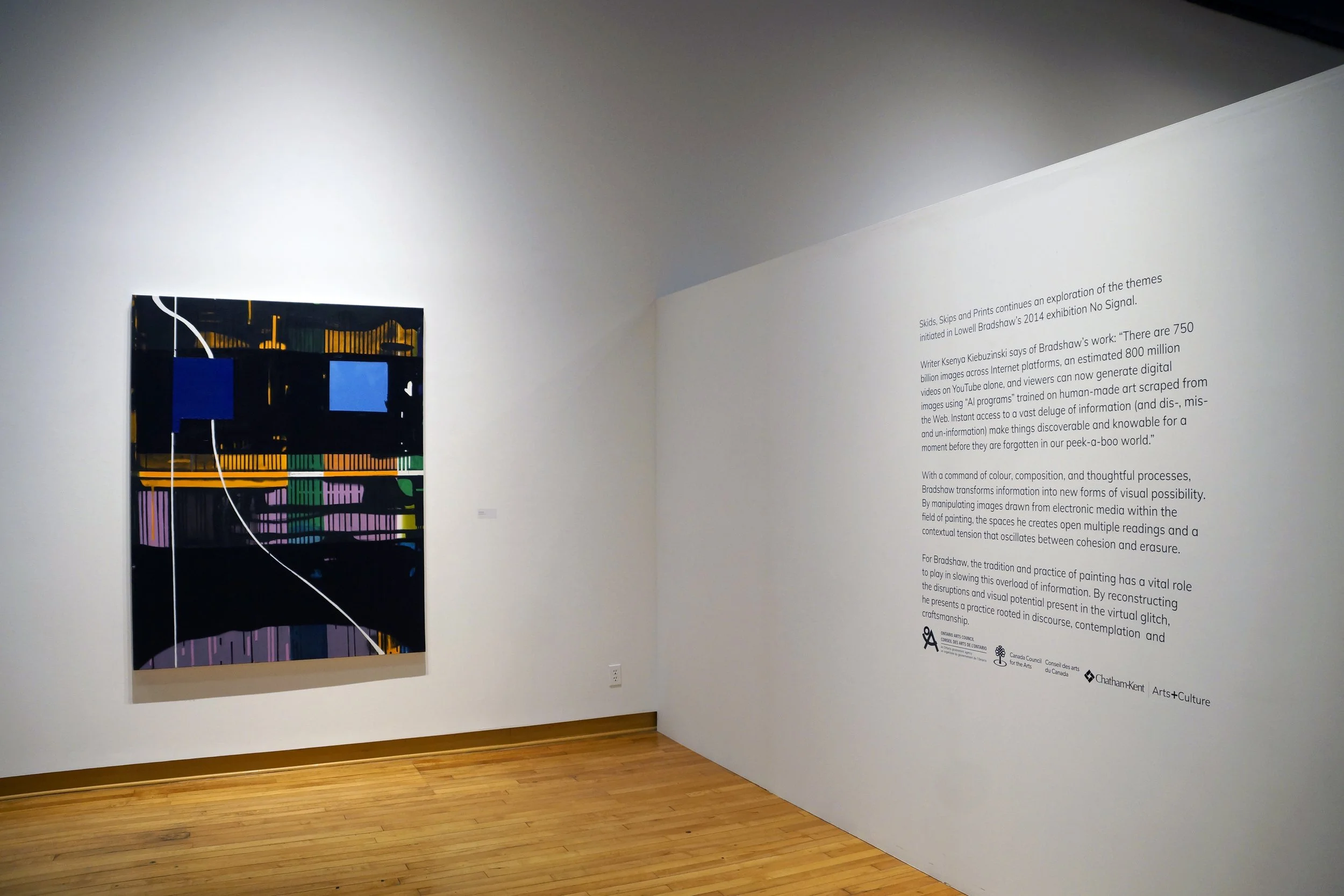 Lowell Bradshaw pushes digital and biotechnical information into new forms of visual possibilities. By manipulating images drawn from electronic media within the field of painting, the spaces he creates open multiple discursive readings and a contextual tension that oscillates between cohesion and erasure. More importantly, perhaps, the artist enlists the pleasure of looking to animate the work, engaging seduction, curiosity, and the drive to uncover new and liberating spaces to inhabit.