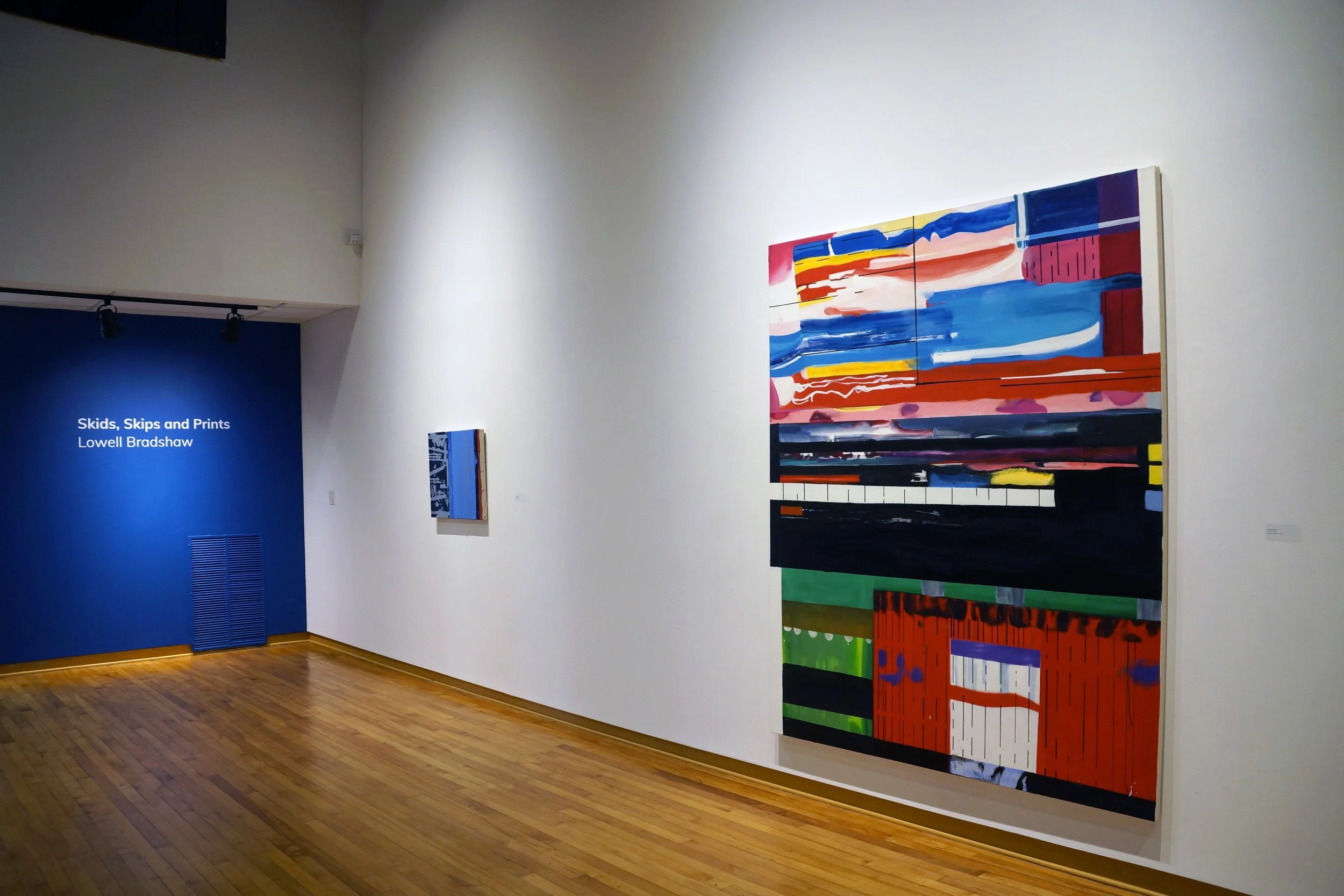 Installation view of "Skids, Skips and Prints" by Lowell Bradshaw (Thames Art Gallery, 2023)