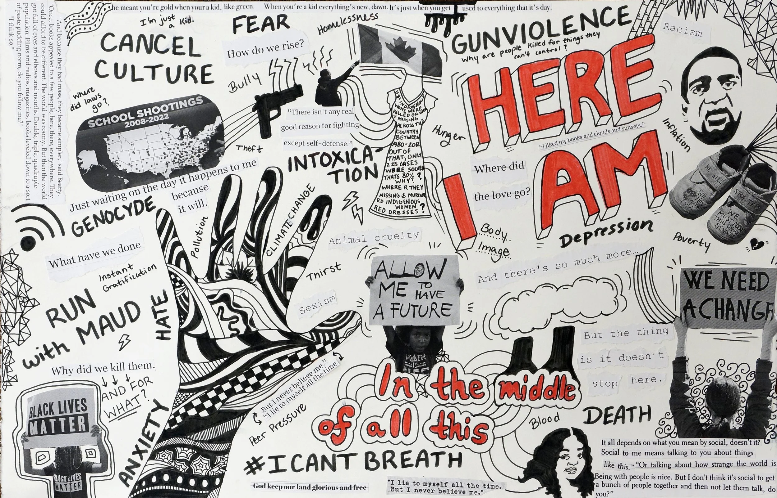 Egan Johnson, I Am Here, 2022. Paint, pencil, pen, marker and crayon on paper. Ursuline College Chatham: Grade 10.