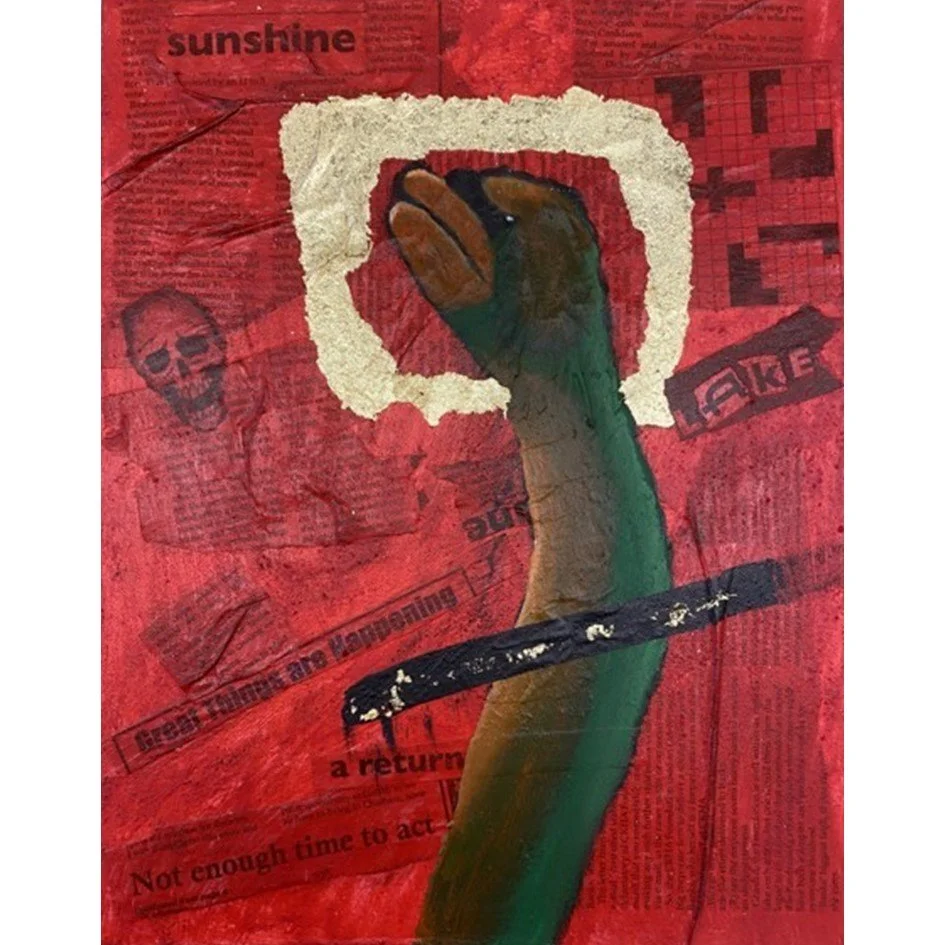 Aynur Ugursal, Odette Passed Away #2. mixed media: gold leaf, acrylic and newspaper. John McGregor Secondary School. Grade 12.